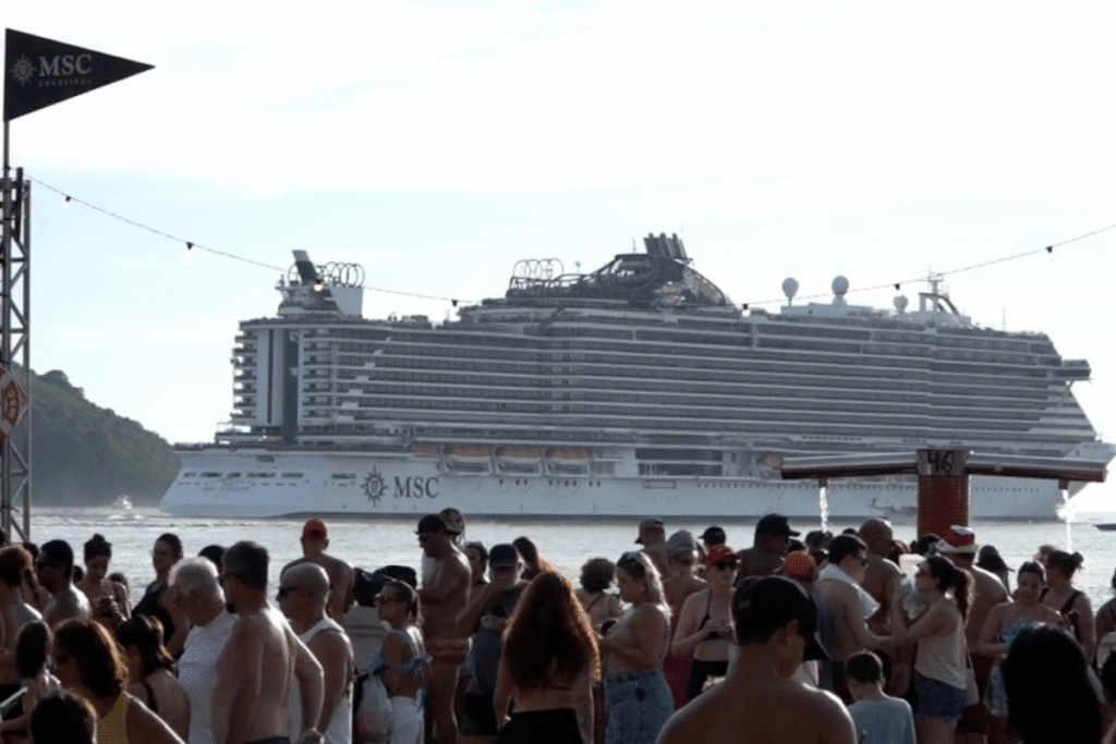 E tem aquele momento cinematográfico que só Santos proporciona: os transatlânticos saindo do Porto enquanto o sol desce e pinta o céu inteiro de cores impossíveis. A bateria toca, as pessoas sambam, a cerveja está gelada, e você pensa “caramba, que sorte a minha de estar em Santos neste exato momento”.