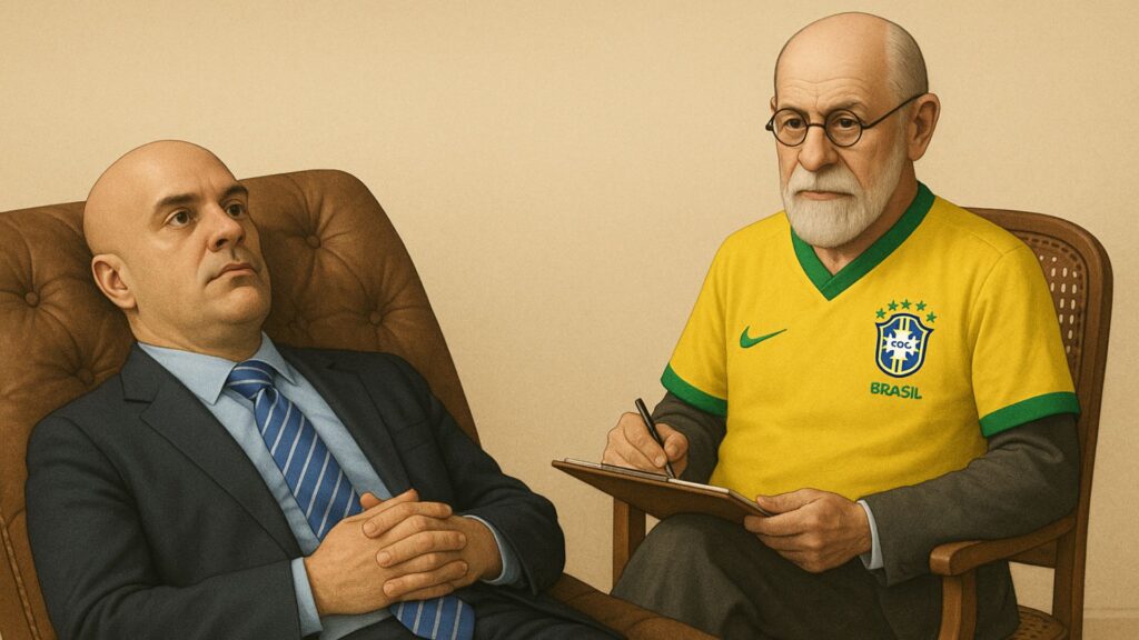 — Ah, é. É que é tanto inquérito que eu até me perco. — Alexandre de Moraes dá uma risadinha que o assessor não ousa retribuir. — Então você, seja lá qual for o seu nome. Mande a PF buscar este homem aqui — diz ele, entregando um mandado de busca e apreensão com o selo STF de autoridade inquestionável. — Já!