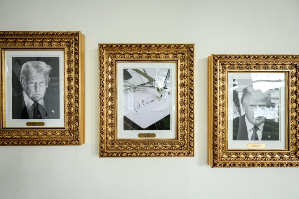 A galeria exibe retratos em preto e branco de todos os ex-presidentes americanos em molduras douradas. No entanto, o espaço destinado ao ex-presidente Joe Biden, do Partido Democrata, foi ocupado por uma imagem de uma assinatura feita com a chamada “caneta automática” – “autopen” -, equipamento que reproduz automaticamente assinaturas.