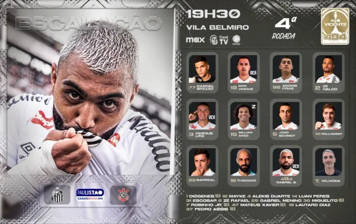 O Santos está escalado para o clássico contra o Corinthians logo mais, às 19h30min, na Vila Belmiro, pela quarta rodada do Paulistão. E o técnico Juan Pablo Vojvoda vai a campo com o que tem de melhor nesse momento.