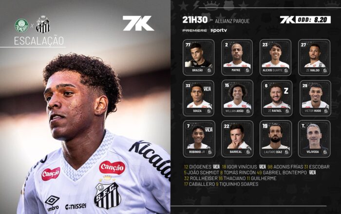 O Santos está escalado para enfrentar o Palmeiras nesta quinta-feira (6), no Allianz Parque, pela 32ª rodada do Campeonato Brasileiro. Juan Pablo Vojvoda definiu a equipe com mudanças em relação ao último jogo.