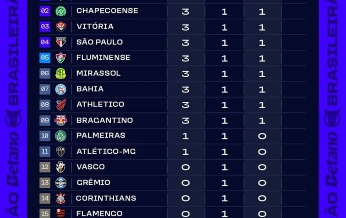 O Botafogo, que goleou o Cruzeiro por 4 a 0, é o líder, seguido pela Chapecoense, Vitória e São Paulo, todos com três pontos ganhos. O Coritiba é o 17ª, Remo o 19º e o Cruzeiro é o lanterna, todos ainda sem pontuar.