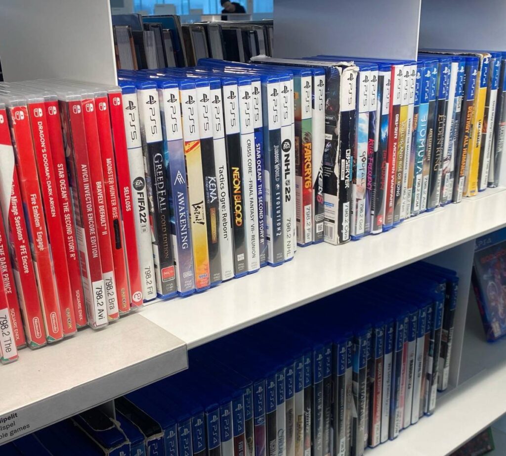 A biblioteca Oodi oferece uma vasta seleção de jogos físicos para consoles como PS5, PS4, PS3, Xbox Series X/S, Xbox One, Xbox 360 e Nintendo Switch. O usuário pode pegar emprestado qualquer um desses títulos como se fosse um livro comum. O prazo de empréstimo é de duas semanas, com possibilidade de extensão por até cinco semanas — o suficiente para terminar até um RPG dos mais longos.