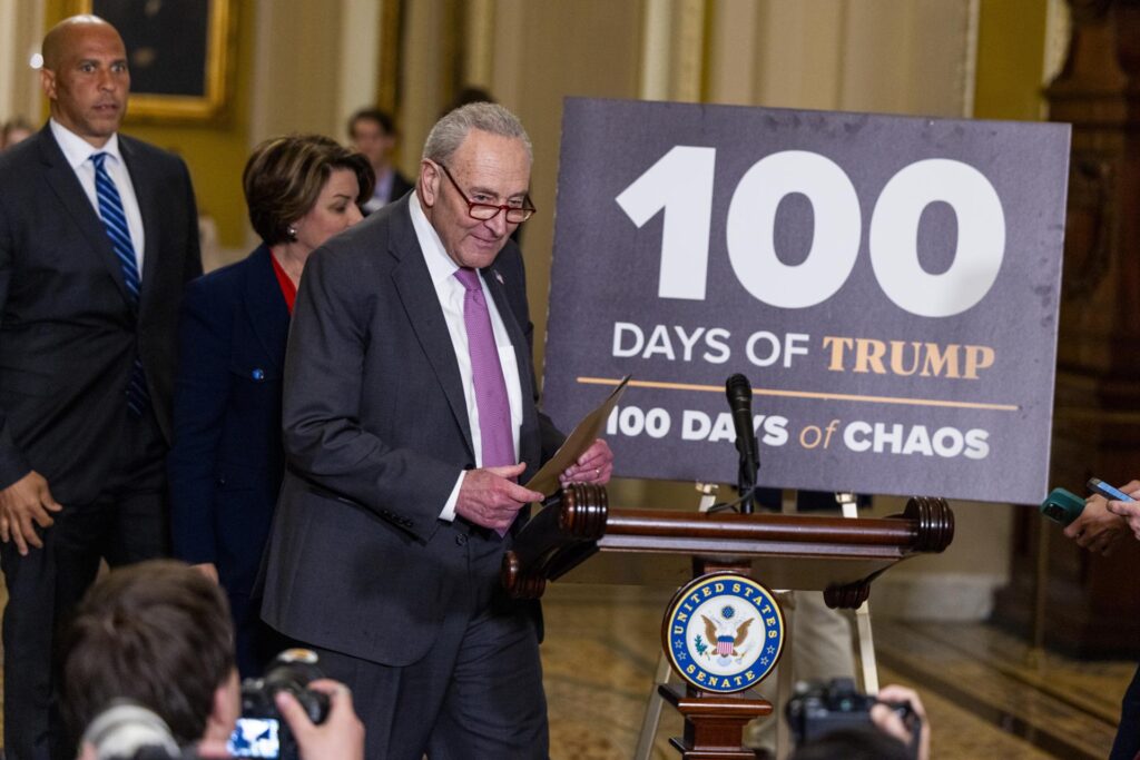 O líder democrata no Senado, Chuck Schumer, exibe um cartaz com a mensagem “Cem dias de Trump, cem dias de caos”, nesta terça-feira (29) (Foto: EFE/EPA/SHAWN THEW)