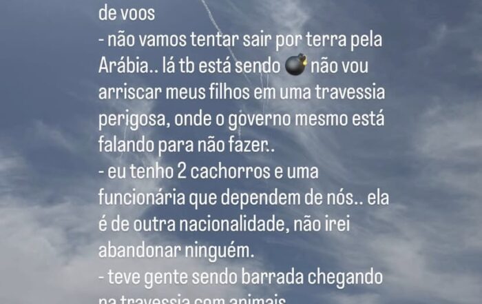“Vou responder no geral aqui as milhões de perguntas: os voos estão fechados no Qatar, não temos previsão de uma abertura de voos, não vamos tentar sair por terra pela Arábia.. lá tb está sendo não vou arriscar meus filhos em uma travessia perigosa, onde o governo mesmo está falando para não fazer, eu tenho 2 cachorros e uma funcionária que dependem de nós.. ela é de outra nacionalidade, não irei abandonar ninguém. Teve gente sendo barrada chegando na travessia com animais ou sai todo mundo.. ou não sai ninguém. No mais é isso.. creio que Deus irá nos proteger e isso logo logo vai acabar”, publicou nos stories do Instagram.