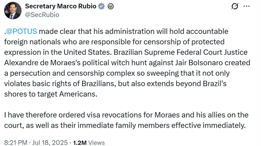 “O presidente Trump deixou claro que seu governo responsabilizará estrangeiros responsáveis pela censura de expressão protegida nos Estados Unidos. A caça às bruxas política do ministro Alexandre de Moraes, do Supremo Tribunal Federal, contra Jair Bolsonaro criou um complexo de perseguição e censura tão abrangente que não apenas viola direitos básicos dos brasileiros, mas também se estende além das fronteiras do Brasil, atingindo os americanos”, escreveu Rubio no X.