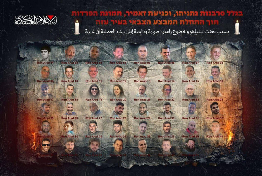 “Devido à recusa de (o primeiro-ministro de Israel, Benjamin) Netanyahu e (o chefe do Estado-Maior, Eyal) Zamir, uma imagem de despedida enquanto a operação militar na cidade de Gaza começa”, diz uma mensagem na parte superior da imagem divulgada pelo grupo islâmico.