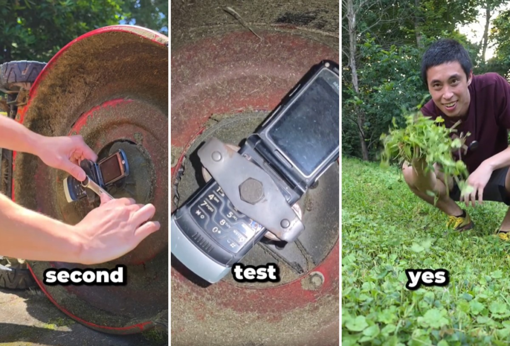 No primeiro teste, o celular se despedaçou antes mesmo de encostar no solo. A força da máquina quebrou o corpo do aparelho, como esperado. No segundo teste, porém, o influenciador usou reforços adicionais para prender o V3 com mais firmeza. Dessa vez, o aparelho resistiu ao giro e conseguiu cortar a grama em uma pequena área. O resultado visual não impressiona, mas o criador resume bem: “Não é bonito, mas funciona”.