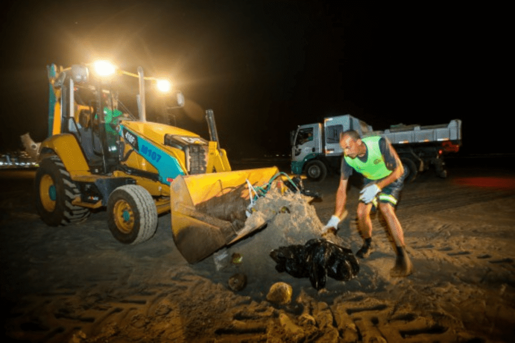 Com tratores, caminhões e rastelos, as equipes trabalharam por nove horas seguidas. Somente às 11h da manhã a operação chegou ao fim. Enquanto isso, o cenário se repetia a cada trecho. Garrafas de vidro, copos plásticos, embalagens e restos de comida cobriam areia e calçadão.