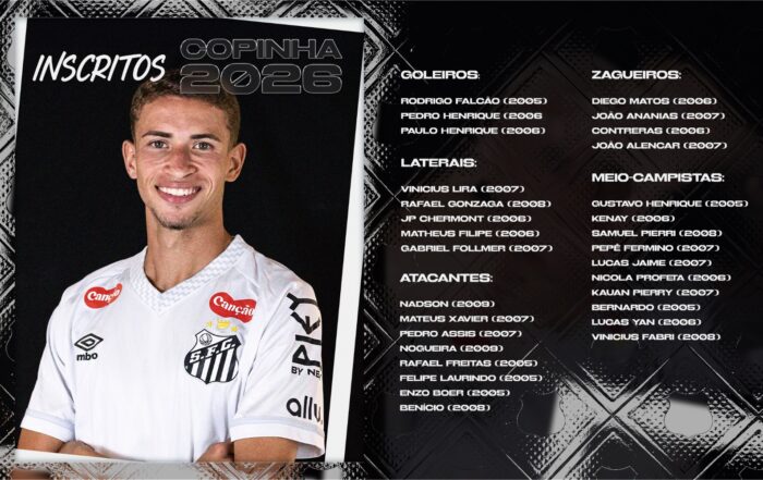 O Santos divulgou nesta terça-feira a lista de inscritos na Copinha 2026. A base do time é o elenco campeão paulista Sub-20 neste ano. O meia Bernardo será o camisa 10 e o atacante Rafael Freitas, que se recupera de uma cirurgia de LCA, está na lista.