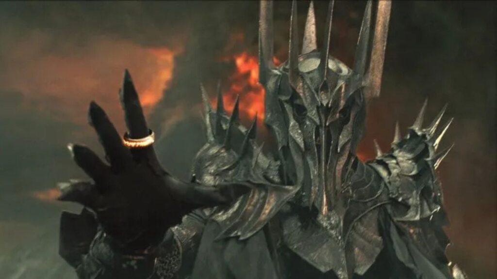 Narrada quase como uma história de terror, a sequência de Peter Jackson, com a voz de Cate Blanchett, mostra Sauron forjando o Um Anel na Montanha da Perdição. Combinando efeitos digitais e cenas com atores reais, a sequência estabelece sua supremacia, mas esconde um detalhe: em 1 hora e 54 minutos de A Sociedade do Anel, enquanto ergue orgulhosamente a mão direita, sem que Celebrimbor perceba, o vilão segura uma adaga na esquerda. São apenas cinco segundos, concebidos para concentrar a atenção do espectador no Anel, tornando essa segunda arma quase imperceptível.