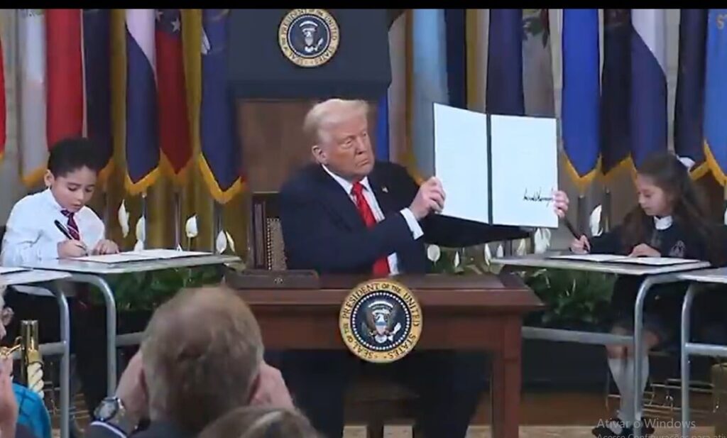 Ao assinar a ação na Casa Branca, Trump cercou-se de crianças que se sentaram em mesas e, simultaneamente à ordem escrita do presidente, assinaram papéis em uma pasta, imitando o líder político. Ao final do gesto, as crianças seguraram os documentos, assim como o republicano.